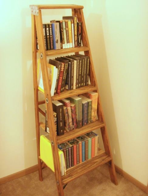 If you have an old wooden ladder that’s largely gathering dust, repurpose it into an extra storage item. Decide how many shelves you need and cut between the rungs of the ladder accordingly. For extra stability, frame the shelving with some old wood and attach a smaller length of rope or string at the top of the unit for hanging. That’s it. Now store your books between each rung.