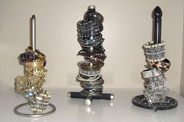 Stowing bracelets away in a drawer is messy, and usually, it something’s out of sight, it’s out of mind. Change that by upcycling a paper towel stand to display bangles and bracelets. Can’t get easier than that.