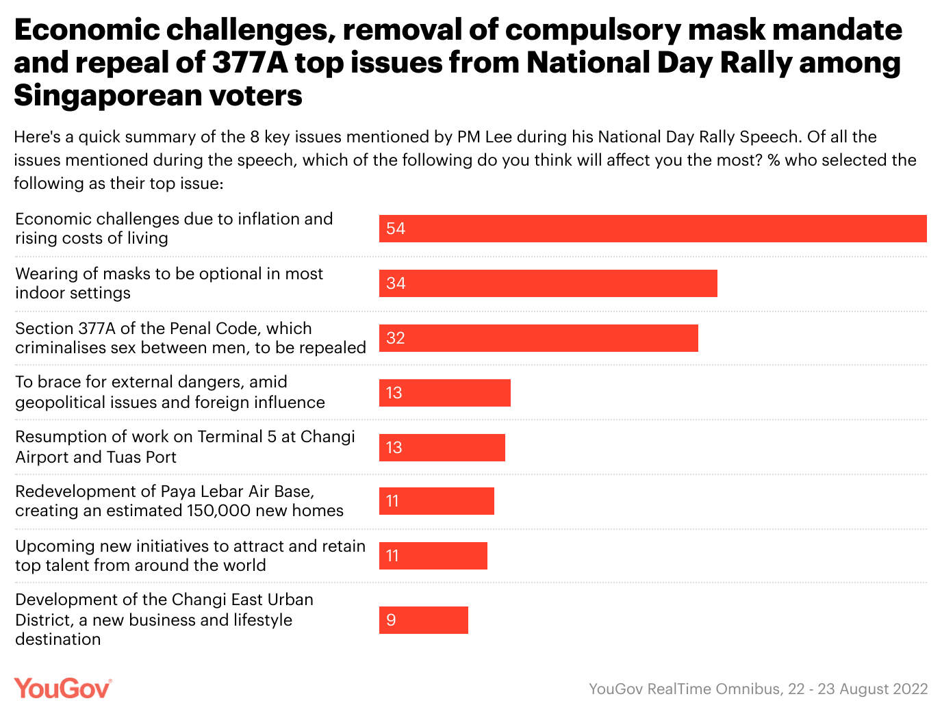According to a recent YouGov survey that asked Singaporeans how they felt about PM Lee’s National Day Rally speech, more than half (54%) ranked economic challenges due to inflation and rising costs of living as the issue that would impact them the most.