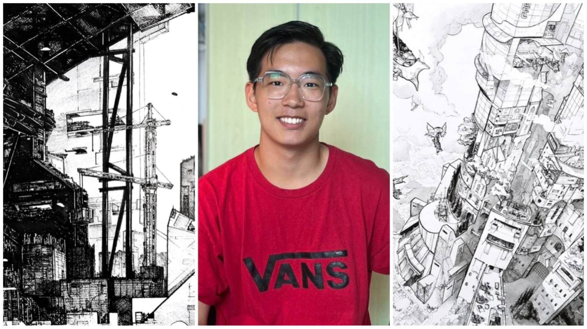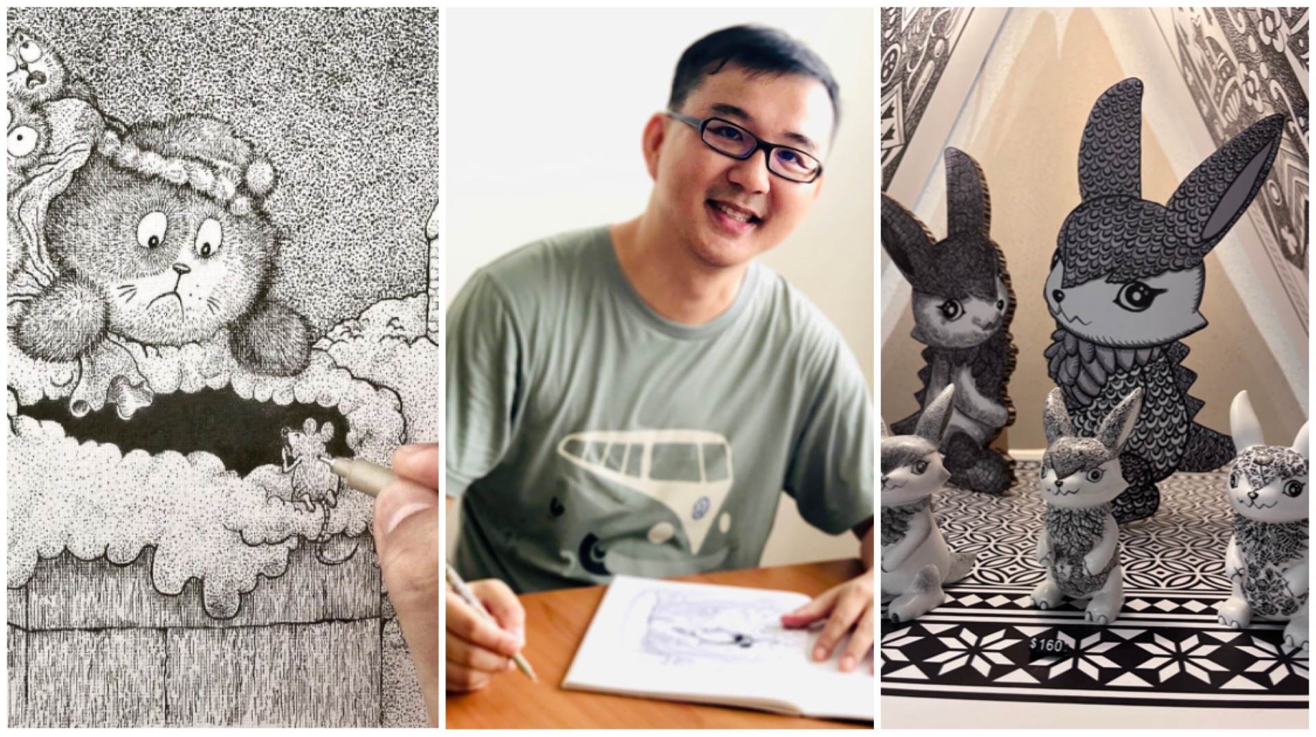 Tin Tin fan and architecture grad Lee Xin Li’s art is all about Singapore, like kueh, iconic buildings, coffee shops and so on. And his style is all about details. Think how a Where’s Wally cartoon looks, then make it very Singaporean and you’ve got Xin Li (but instead of searching for Wally, you will be pinpointing chwee kueh from a smorgasbord of food or looking for Suntec City in a majestic black and white landscape of Singapore).