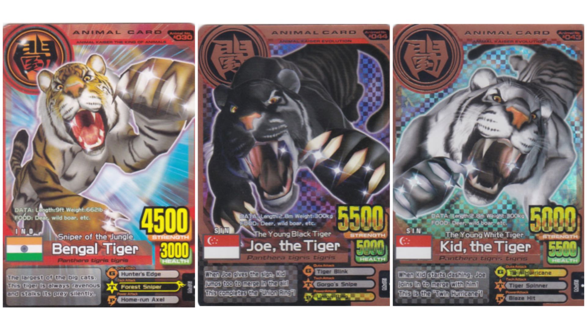 Nowadays it’s all Pokémon arcade games in every mall, but there was a time years and years ago when kids fought over which animals were the strongest in the "Animal Kaiser" arcade/card game machine. Of course, there were tigers including the Bengal Tiger and “hero animals” Joe and Kid Tiger. Fun fact: this video game included the Merlion too.