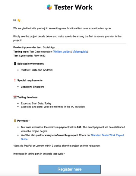 The platform I tried is called Tester Work, which pays users for every unique reported bug or a fixed amount for a test case execution. The remuneration is clearly stated in the assignment so that you can decide if the task is worth your time. You’ll get paid in US Dollars via PayPal.
