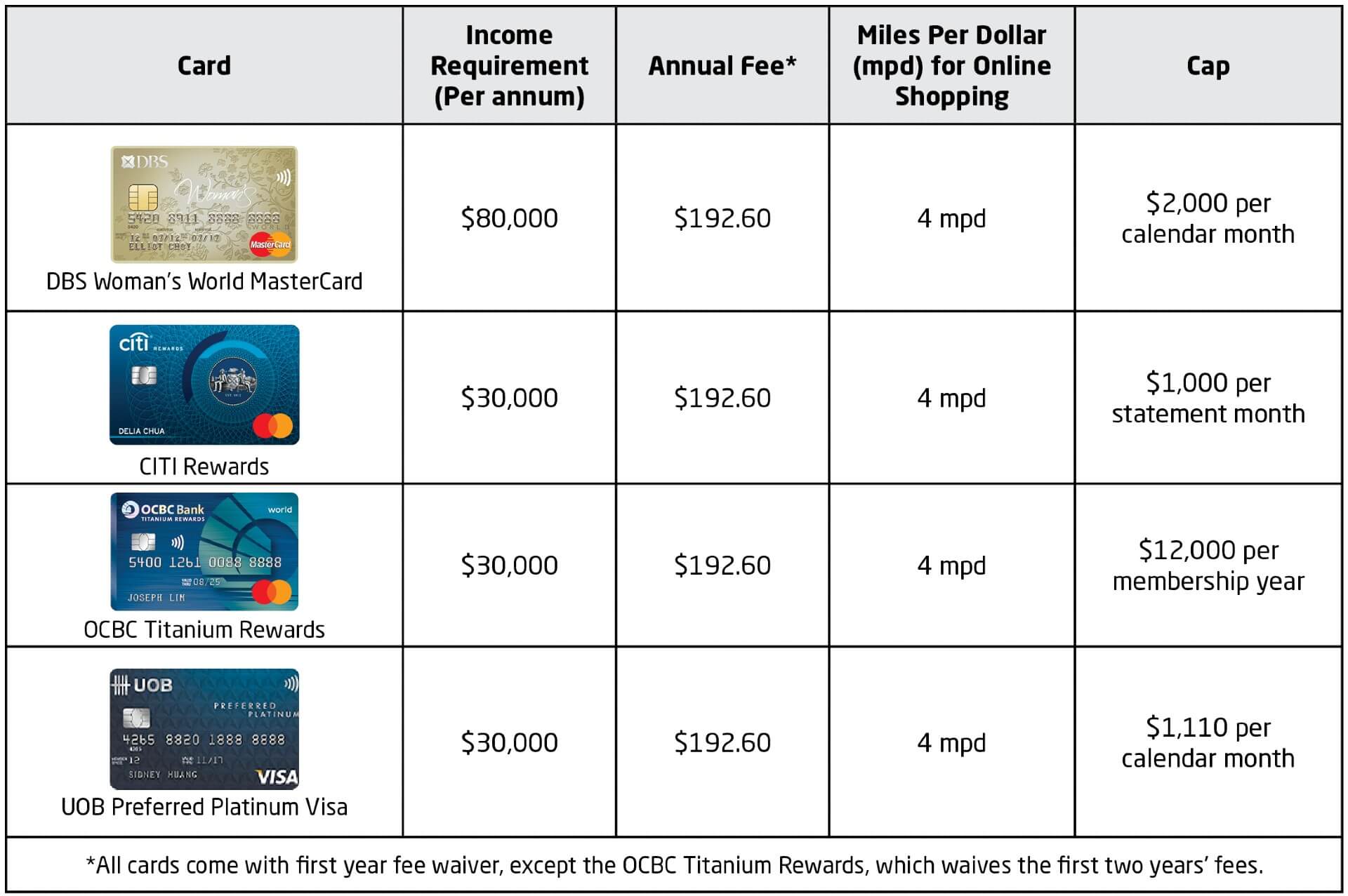 Protip: You’ll see that there’s a Blue and Pink version of the OCBC Titanium Rewards Card. Each has their own $12,000 cap, so by applying for both, you can earn 4 mpd on up to $24,000 of spending each year.