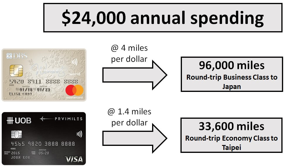 To illustrate, suppose you spent $24,000 online over the course of a year. If you put all that on the UOB PRVI Miles Card, you’d walk away with 33,600 miles - a decent enough return, and enough for a holiday to Taipei. But had you put that on the DBS Woman’s World Card, the same amount of spending would yield 96,000 miles - enough for a round-trip Business Class ticket to Japan.