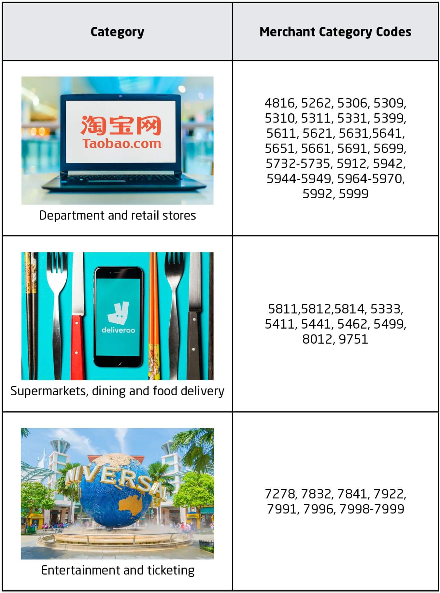 *An MCC is a four-digit code used to denote a merchant’s principal line of business. For example, Marks & Spencer, Isetan and Takashimaya transactions would code as MCC 5311: Department Stores. Likewise, Apple and Audio House would code as MCC 5732: Electronics Stores