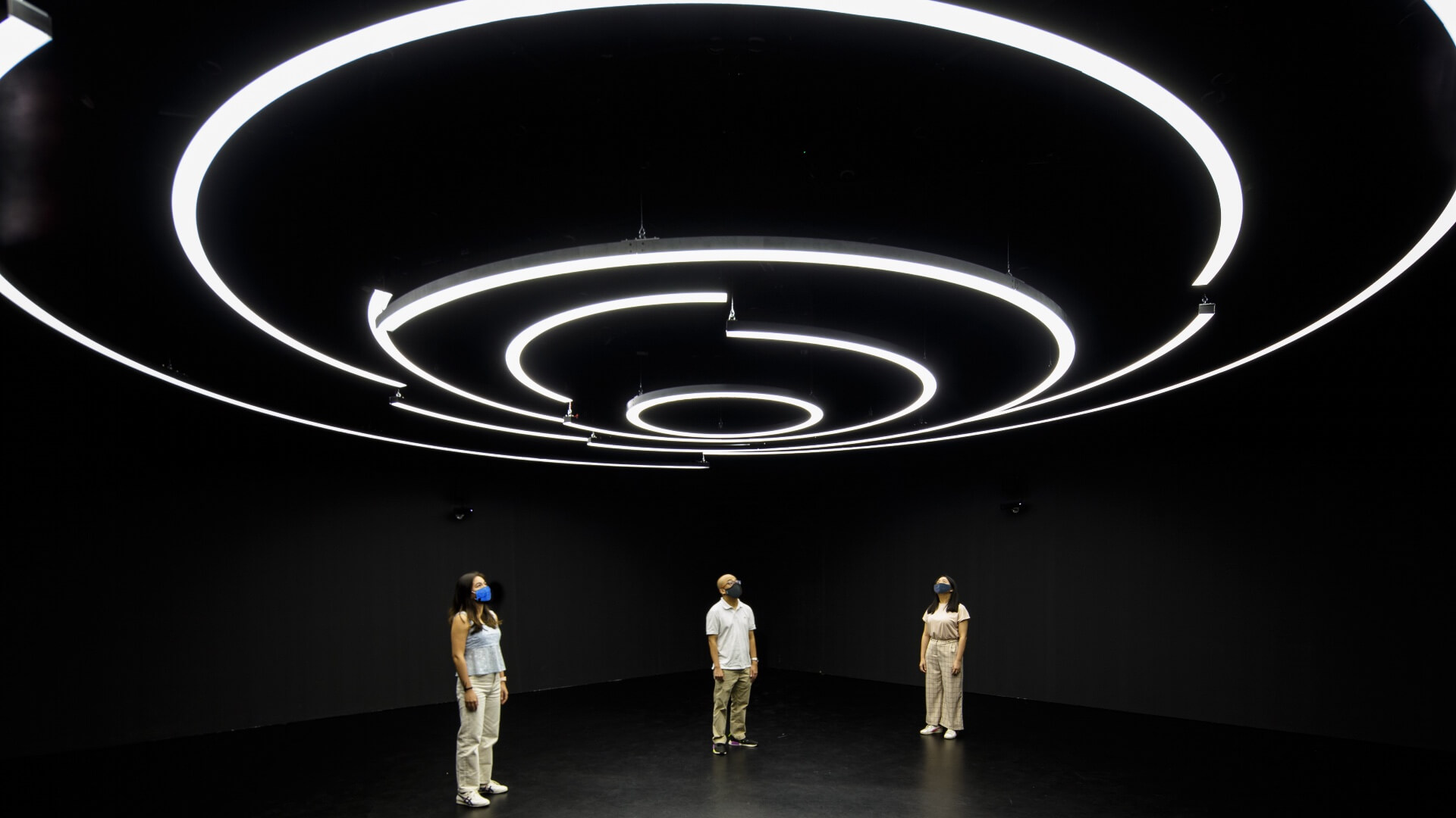 Your movement in the room will trigger the lights from the circular rings above as well as sounds and music from the game. Stand together in a ring with the other visitors close to the middle and watch the magic happen.