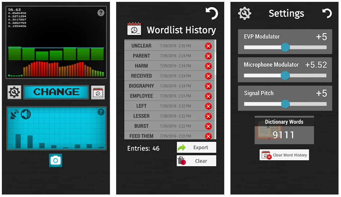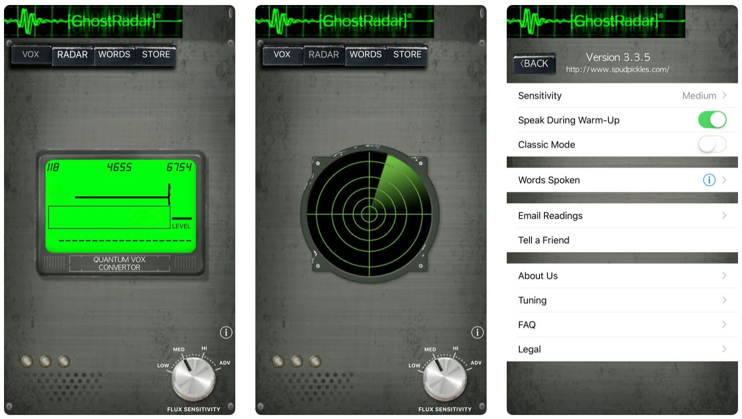 The first app we tried was Ghost Radar Legacy. Coloured circles thatshow up on a radar indicate that there are ghosts around you. I saw green circles and red circles… no idea what that meant. Possibly how hostile they were? The also “translates” ghost-speak into legible words, but all I got was nonsense.
