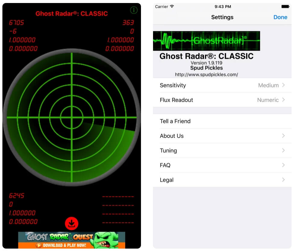 The next app up for trial was Ghost Radar Classic, the original version of the previous app. No idea what the numbers surrounding this more old school radar were, but it worked just like Legacy – coloured circles indicate if ghosts are around you. I also saw yellow and blue circles in addition to green and red ones. Some of the circles indicated that there were ghosts behind me. I ignored the readings (should I have?) and decided to try a different app.