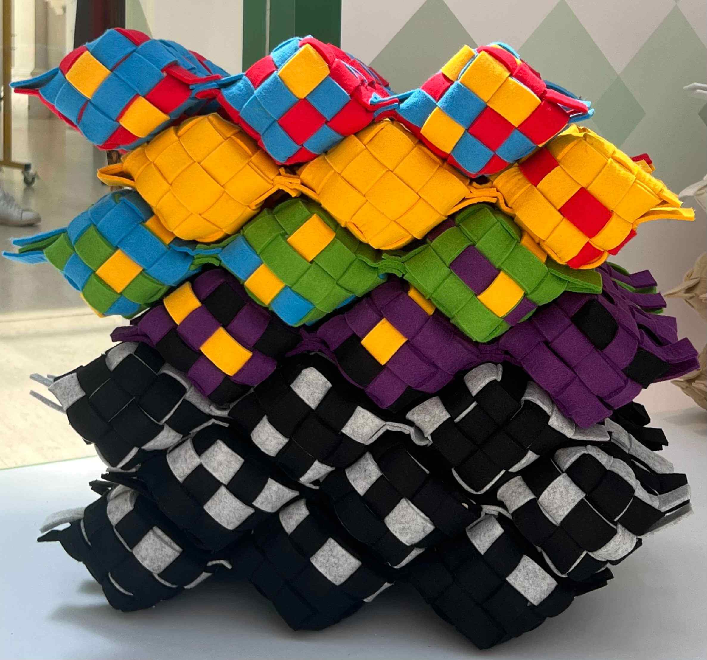 Instead of coconut leaves and rice cakes, strips of thick felt have been woven around foams of different densities, a technique inspired by the function of ketupats as containers. And yes, you can rearrange the modular nature of the furniture for a variety of functional everyday uses. Go ketupat crazy!