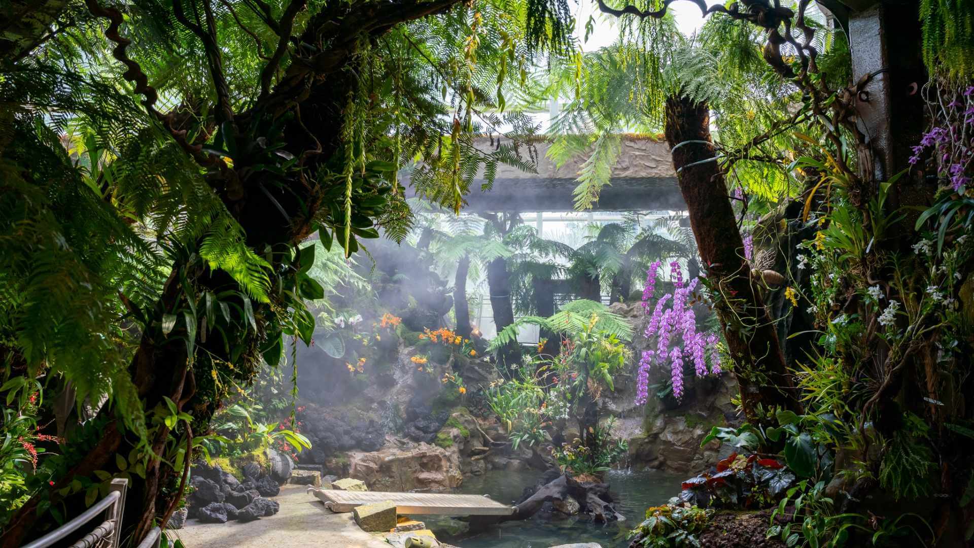 In addition, the display houses are connected by a "Secret Ravine", which mimics ravine habitats found in deep, narrow valleys of tropical mountains. Keep your eyes peeled to catch a glimpse of rare orchids and ferns that grow on the ground or in rock crevices.