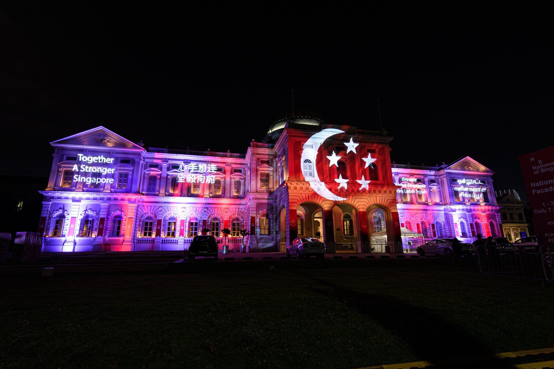 For the entire month of August, seven buildings in the Bras Basah-Bugis precinct will have the patriotic colours of red and white light shone onto them. The buildings are: