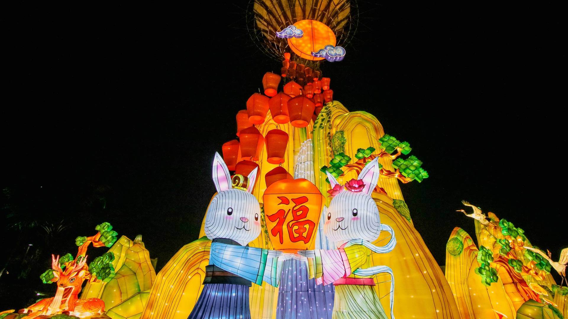 Light up your weekend with Gardens by the Bay's Mid-Autumn festivities. Be wowed by the breathtaking "Sky Lanterns" set, where elegant sky lanterns "float" up the Supertrees against a picturesque mountainscape backdrop, with a pair of rabbits releasing their own sky lantern at the same time. Another highlight is the "Rabbits' Forest" set, where you and your family can try to spot the Jade Rabbit for good blessings.